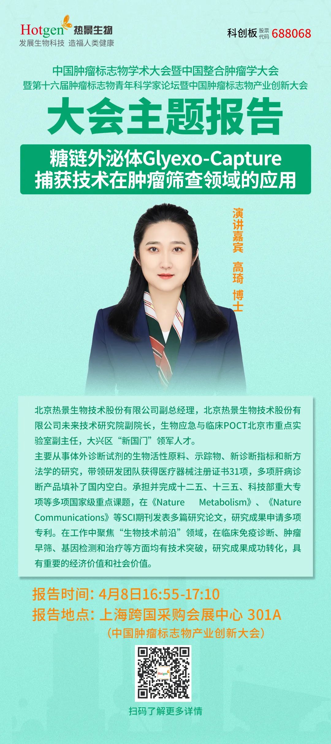 4月8日下午,北京熱景生物技術(shù)股份有限公司副總經(jīng)理,北京熱景生物未來技術(shù)研究院副院長高琦博士受邀在中國腫瘤標(biāo)志物產(chǎn)業(yè)創(chuàng)新大會分享創(chuàng)新技術(shù)報告《糖鏈外泌體Glyexo-Capture捕獲技術(shù)在腫瘤篩查領(lǐng)域的應(yīng)用》。
