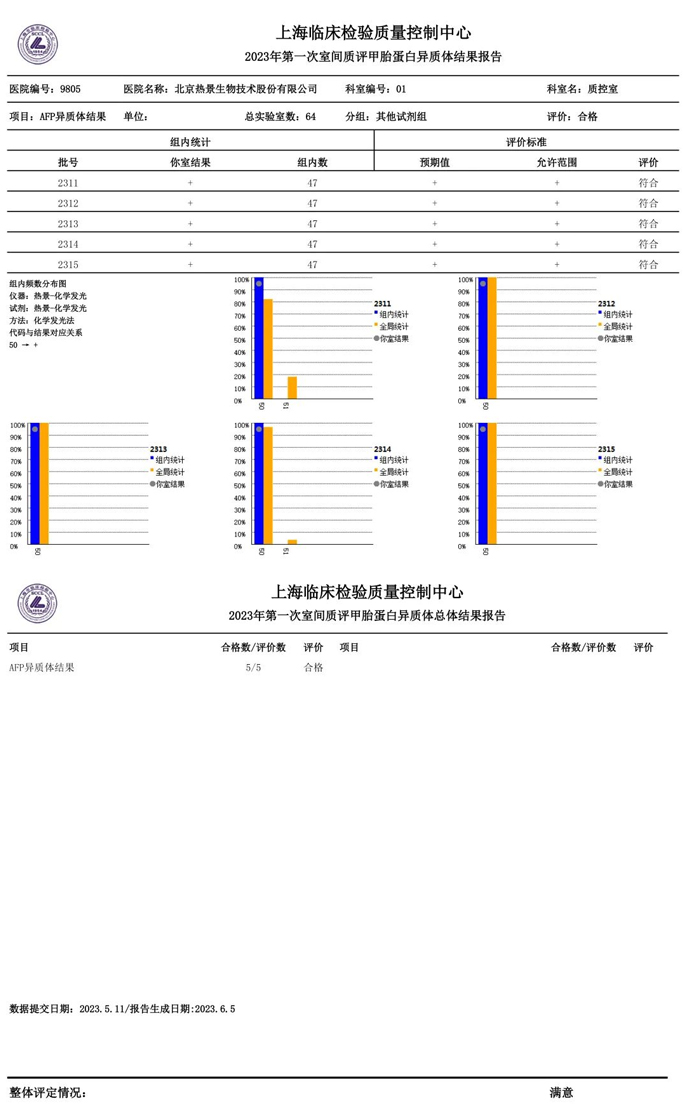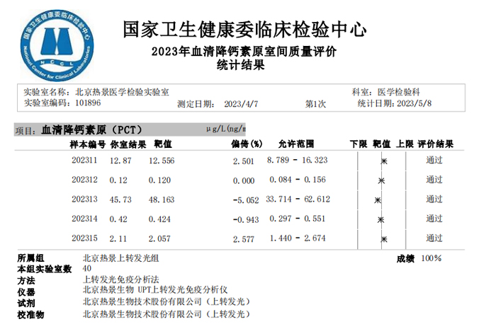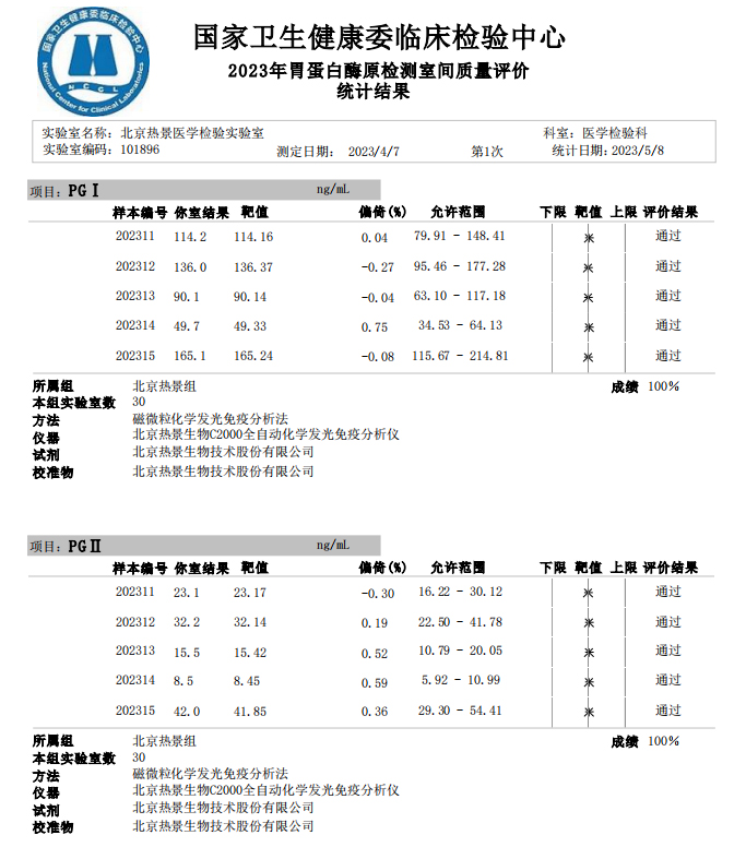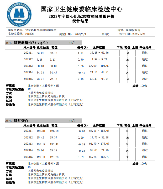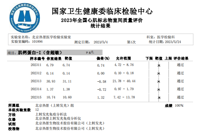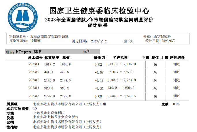 近日,國家衛(wèi)生健康委臨床檢驗中心(NCCL)公布了2023年多項全國臨床檢驗室間質(zhì)量評價結(jié)果。熱景生物旗下熱景醫(yī)學(xué)檢驗實驗室以100分的優(yōu)異成績通過“胃蛋白酶原”“血清降鈣素原”“N末端前腦鈉肽”“心肌標志物”等室間質(zhì)評項目。同時,熱景生物參與的上海市臨床檢驗中心2023年第一次能力驗證項目,包括B型鈉尿肽/N端-B型鈉尿肽前體、AFP異質(zhì)體比率、肌鈣蛋白I、降鈣素原等項目均通過驗證,充分彰顯了熱景生物穩(wěn)定可靠的實驗室質(zhì)量管理和檢測能力,以及強大的產(chǎn)品和技術(shù)實力!
