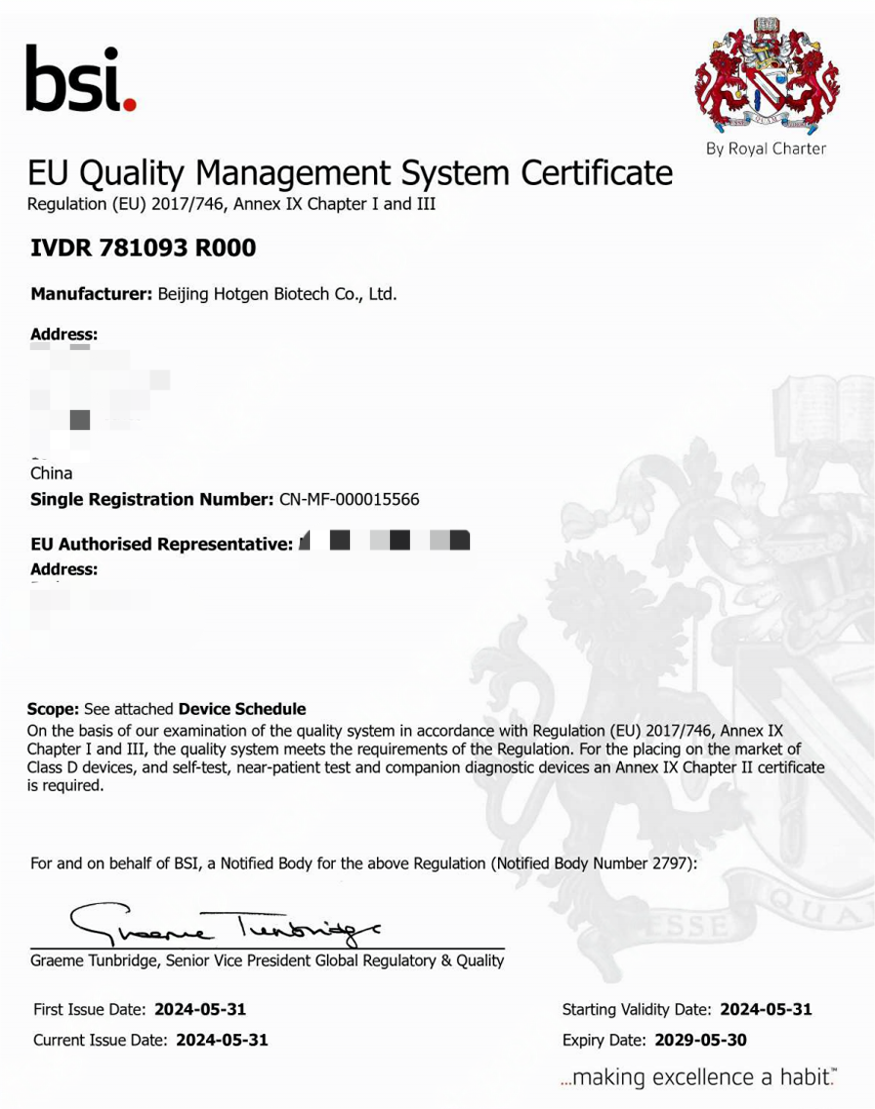 近日,熱景生物在歐盟體外診斷醫(yī)療器械法規(guī)(IVDR)下新增29款診斷產(chǎn)品的CE認證。該CE IVDR證書由歐洲最有聲望的認證機構之一英國標準協(xié)會(BSI)頒發(fā)。新批準的29種診斷試劑覆蓋了熱景生物旗下全系列的的免疫檢測產(chǎn)品,包括化學發(fā)光、上轉發(fā)光、膠體金和酶聯(lián)免疫產(chǎn)品線下的B類和C類試劑。這一成果豐富了公司在國際業(yè)務板塊的產(chǎn)品解決方案,并進一步提升了市場綜合競爭力,為加速拓展國際市場提供了強有力的抓手。