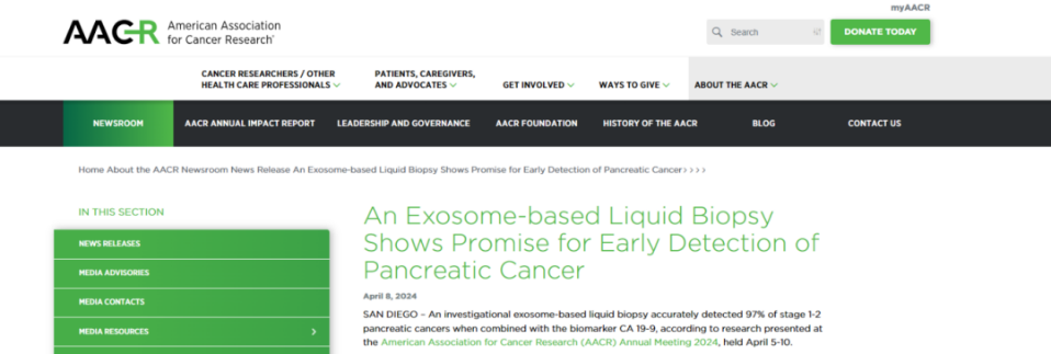 根據(jù)2024美國癌癥研究協(xié)會(huì)(AACR)年會(huì)上發(fā)表的一項(xiàng)研究,在結(jié)合生物標(biāo)志物CA 19-9的情況下,基于外泌體的液體活檢可準(zhǔn)確檢測(cè)出97%的Ⅰ~Ⅱ期胰腺癌。