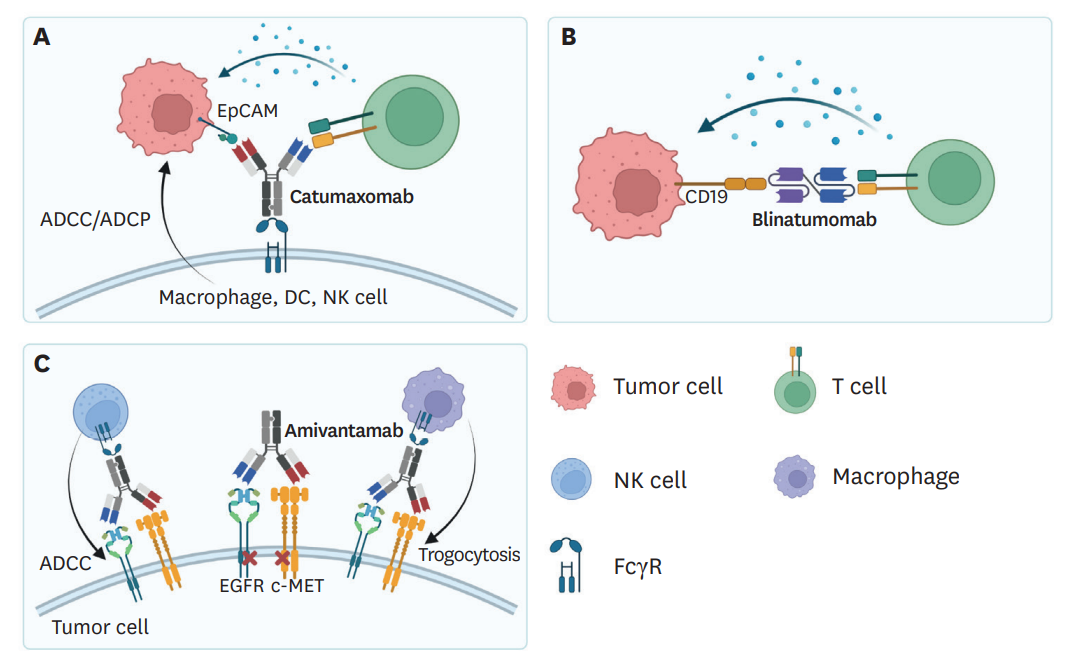 癌癥免疫療法中使用的大多數(shù)bsAbs通過T細(xì)胞驅(qū)動(dòng)的天然或內(nèi)源性免疫發(fā)揮作用,包括免疫檢查點(diǎn)抑制(CPIs)效應(yīng)細(xì)胞接合器(包括TCE和ICEs)以及共刺激性bsAb。