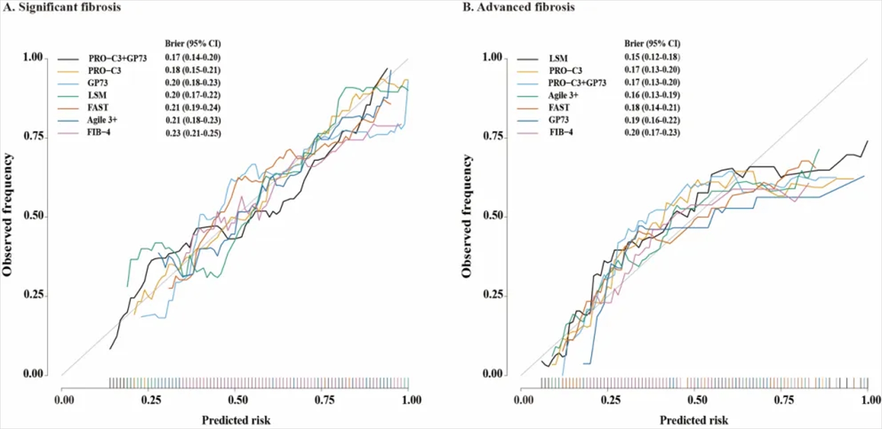 校準(zhǔn)曲線也顯示,在診斷顯著纖維化方面,PRO-C3聯(lián)合GP73的Brier評分最低(0.17),其次是PRO-C3、LSM、GP73、FAST、Agile 3+、FIB-4(圖2A)。在診斷進展期纖維化方面,PRO-C3和PRO-C3聯(lián)合GP73模型的Brier評分均為0.17,其診斷效能優(yōu)于FIB-4(0.20)和FAST(0.18)(圖2B)。