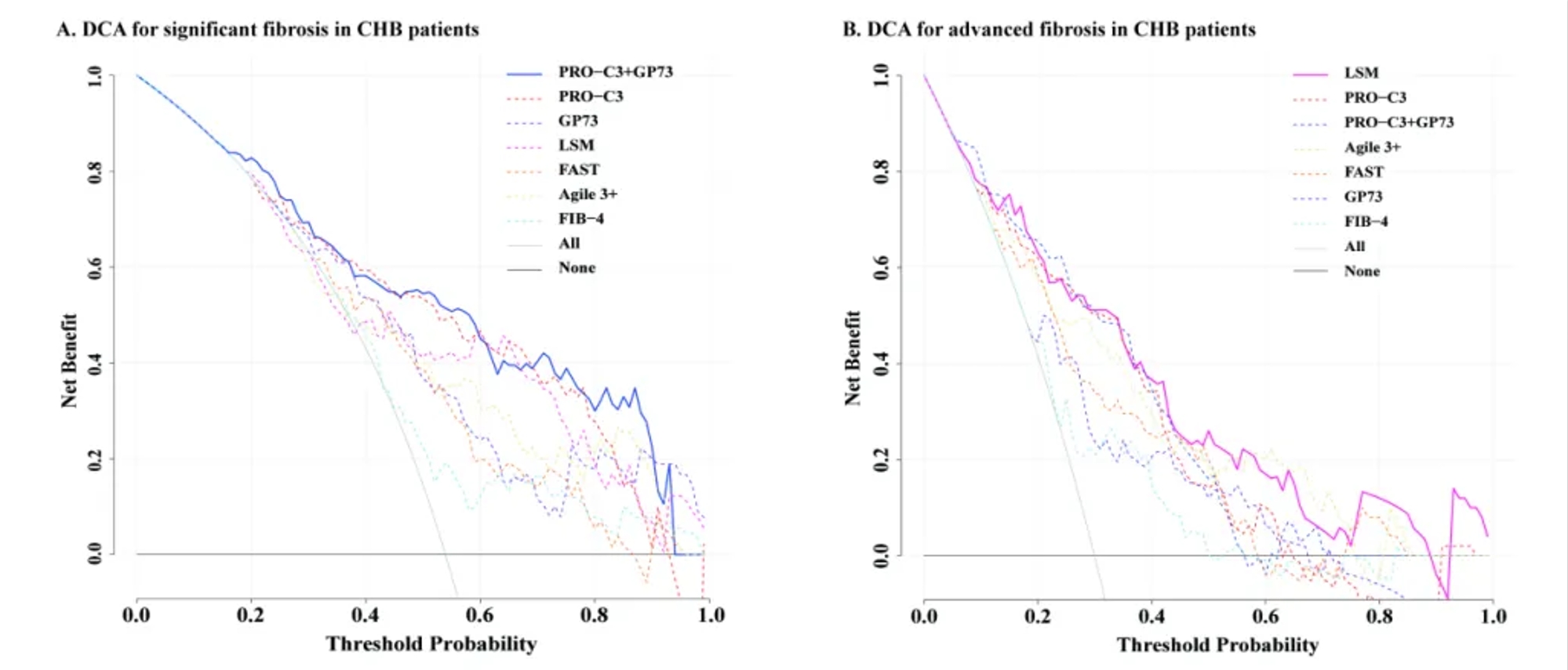 此外,決策曲線分析同樣顯示PRO-C3聯(lián)合GP73在預(yù)測顯著纖維化方面臨床凈收益最高(圖3A)。