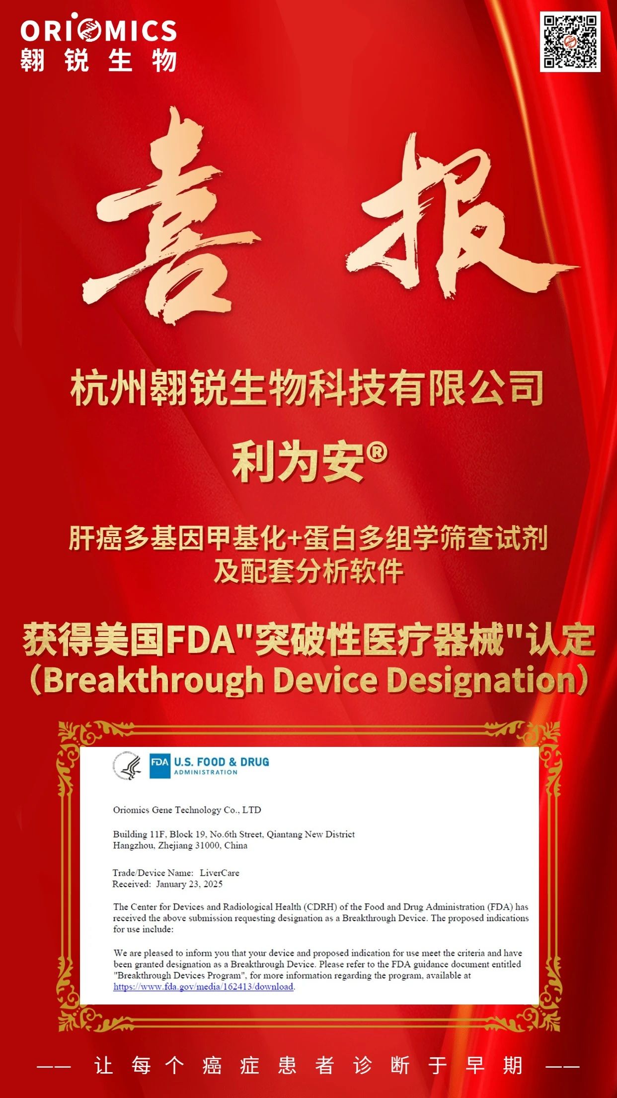 2025年3月21日,熱景生物參股企業(yè)翱銳生物旗下早篩產(chǎn)品利為安?——肝癌多基因甲基化+蛋白多組學(xué)篩查試劑及配套分析軟件獲得美國(guó)食品藥品管理局(FDA)“突破性醫(yī)療器械”(Breakthrough Device Designation)認(rèn)定。